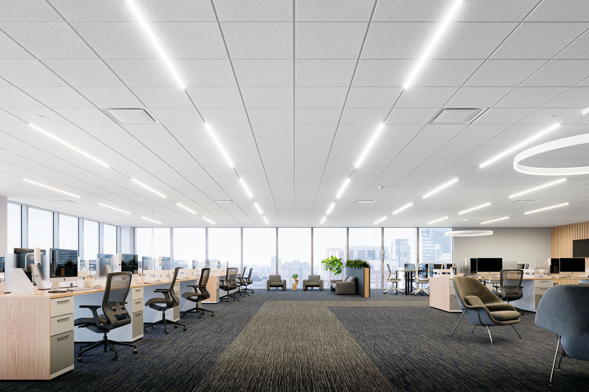 Systemhimlinger – fra mineralull og gips til strekkmetall og tre. Regulerer akustikk og skjuler tekniske installasjoner.